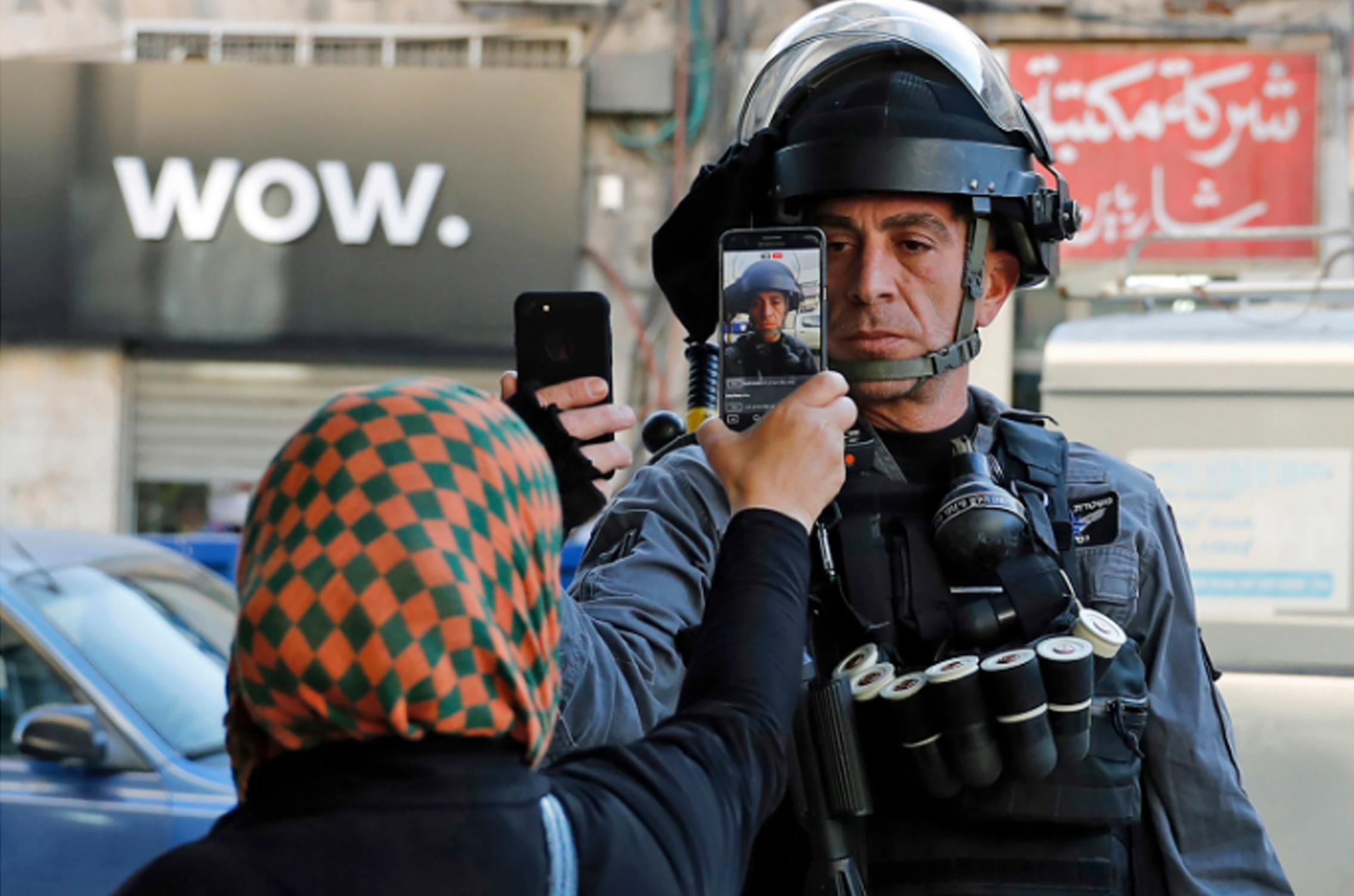 فلسطینی ها به تصمیم ایالات متحده در اعلام اورشلیم به عنوان پایتخت اسرائیل و انتقال سفارت از تل آویو به اورشلیم اعتراض می کنند. یک زن فلسطینی از یک نیروی بیگانه عکس می گیرد