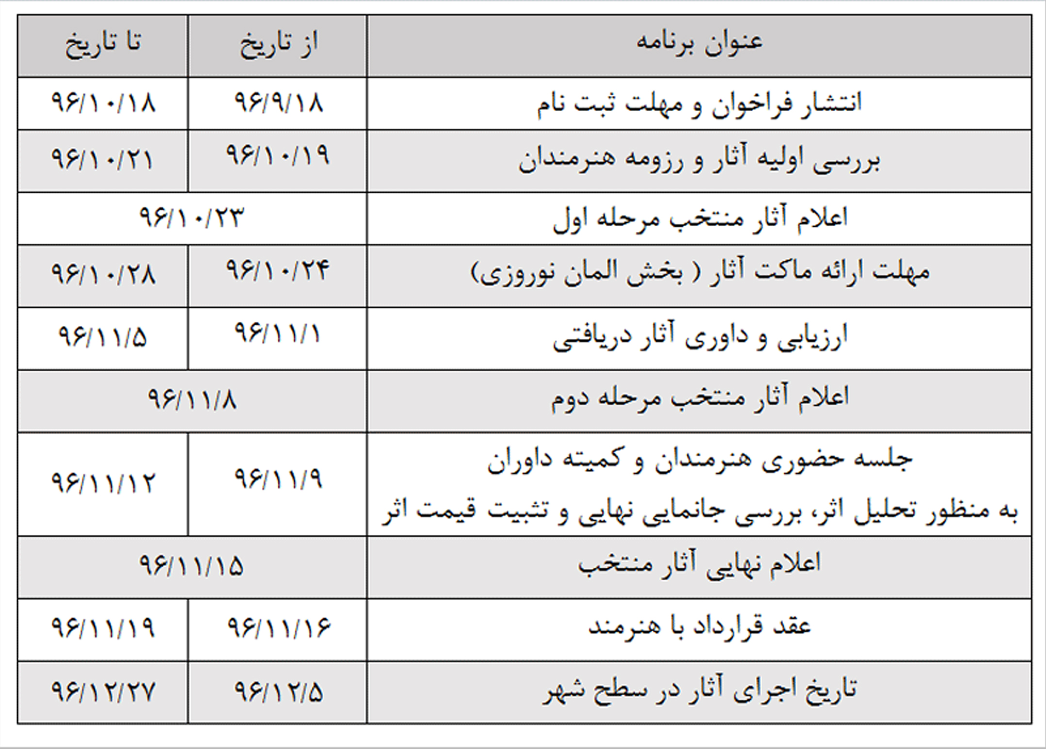 - تمامی هنرمندانی که طرح آنها توسط کمیته فنی برگزیده میشود، ضروری است در جلسهای باحضور کمیته داوران، به منظور تحلیل اثر، ویرایش ایدهها، تنظیم و هماهنگسازی تکنیکها و روشهای اجرایی در شهر، توسعه و مناسبسازی طرحها، تثبیت و جانمایی موقعیتهای اجرایی آثار و بررسی و تعیین قیمت نهایی اثر، حضور یابند.