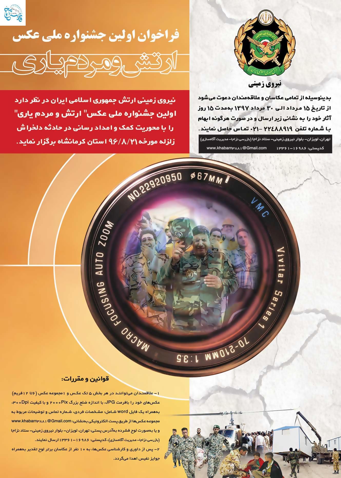 نیروی زمینی ارتش جمهوری اسلامی ایران در نظر دارد اولین جشنواره ملی عکس ارتش و مردم‌یاری را با محوریت کمک و امدادرسانی در حادثه دلخراش زلزله مورخه 21/8/96 استان کرمانشاه برگزار کند.