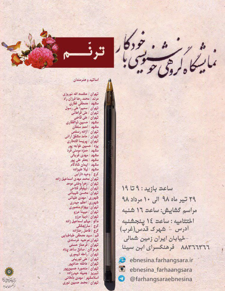 به گزارش روابط عمومی مرکز تجسمی حوزه هنری به نقل از فارس، نمایشگاه گروهی خوشنویسی با خودکار با عنوان « ترنم » از ۲۹ تیر در فرهنگسرای ابن سینا گشایش یافت و تا ۱۰ مردادماه ادامه دارد.